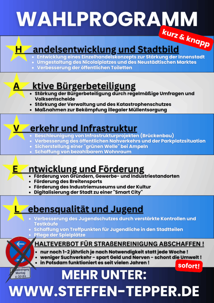 Dieses Wahlprogramm ist aus einem intensiven Austausch mit zahlreichen Bürgerinnen und Bürgern unserer Stadt entstanden. Denn wer könnte besser wissen, wo in Brandenburg an der Havel Handlungsbedarf besteht, als wir selbst? Unsere Gespräche haben die Grundlage für diese Vorschläge gebildet, die die tatsächlichen Anliegen und Bedürfnisse der Brandenburgerinnen und Brandenburger widerspiegeln – eine Expertise, die über bloße Annahmen von Parteien hinausgeht.